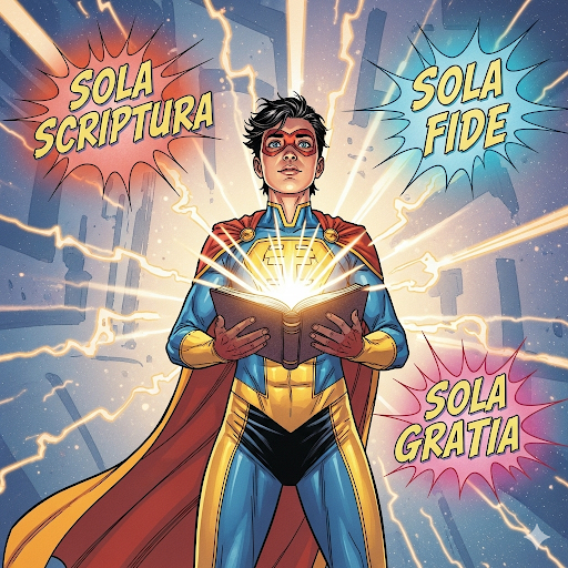 루터가 살았던 시대의 사람들은 하나님을 믿는 것을 아주 어렵게 생각했어요. 마치 복잡한 게임 퀘스트처럼요. 죄를 용서받으려면 교회에서 정한 규칙을 따라야 했고, 심지어 돈을 내야 죄를 용서받는다고 믿었죠. '면죄부'라는 것을 사면 천국에 갈 수 있다고 말했어요. 루터는 이 모든 것이 하나님 말씀과 다르다는 것을 깨달았어요. 그는 **"오직 성경으로!"**라고 외치며 진정한 종교개혁을 시작했습니다. **'오직 성경'**을 의미하는 헬라어는 Sola Scriptura인데, 이는 '모든 가르침의 기준은 오직 성경뿐이다'라는 뜻이에요. 사람의 생각이나 돈, 교회의 권위가 아니라 오직 성경만이 진짜라는 거죠.