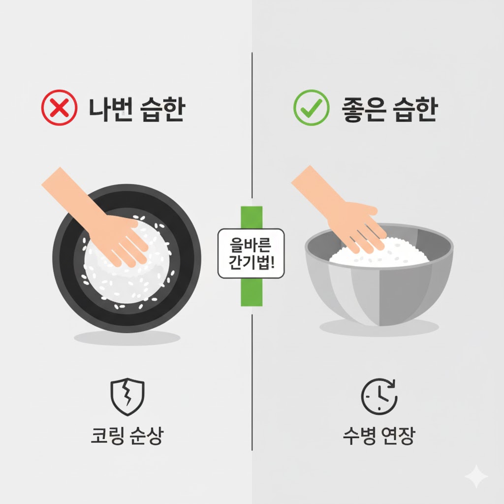 | 1. 내솥에 쌀을 바로 씻는다. | 코팅 손상의 주범: 쌀알은 단단한 결정 구조를 가지고 있어, 손으로 쌀을 비빌 때 발생하는 마찰력이 내솥의 불소수지(테프론) 코팅에 미세한 흠집을 만듭니다. 이 손상은 코팅을 벗겨지게 해 밥이 눌어붙고, 코팅 성분이 음식에 섞여 나올 위험(건강 문제)을 증가시킵니다. | 스테인리스볼 또는 전용 쌀 씻는 용기를 사용하여 쌀을 씻은 후, 깨끗하게 헹군 쌀만 내솥에 옮겨 담습니다. |