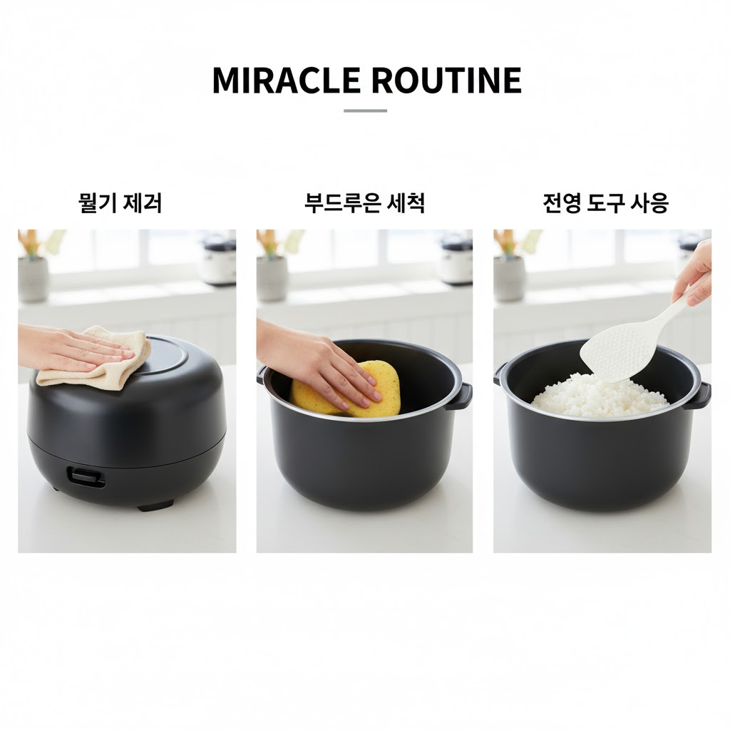 | 3. 철 수세미나 날카로운 조리도구를 사용한다. | 영구적인 코팅 파괴: 내솥의 코팅층은 생각보다 얇고 민감합니다. 금속 재질의 조리도구나 거친 수세미 사용은 코팅을 즉각적으로 긁어내 영구적인 손상을 일으킵니다. | 부드러운 스펀지를 사용하여 중성세제로 세척하고, 밥을 뜰 때는 반드시 밥솥에 포함된 플라스틱 또는 나무 주걱을 사용합니다. |