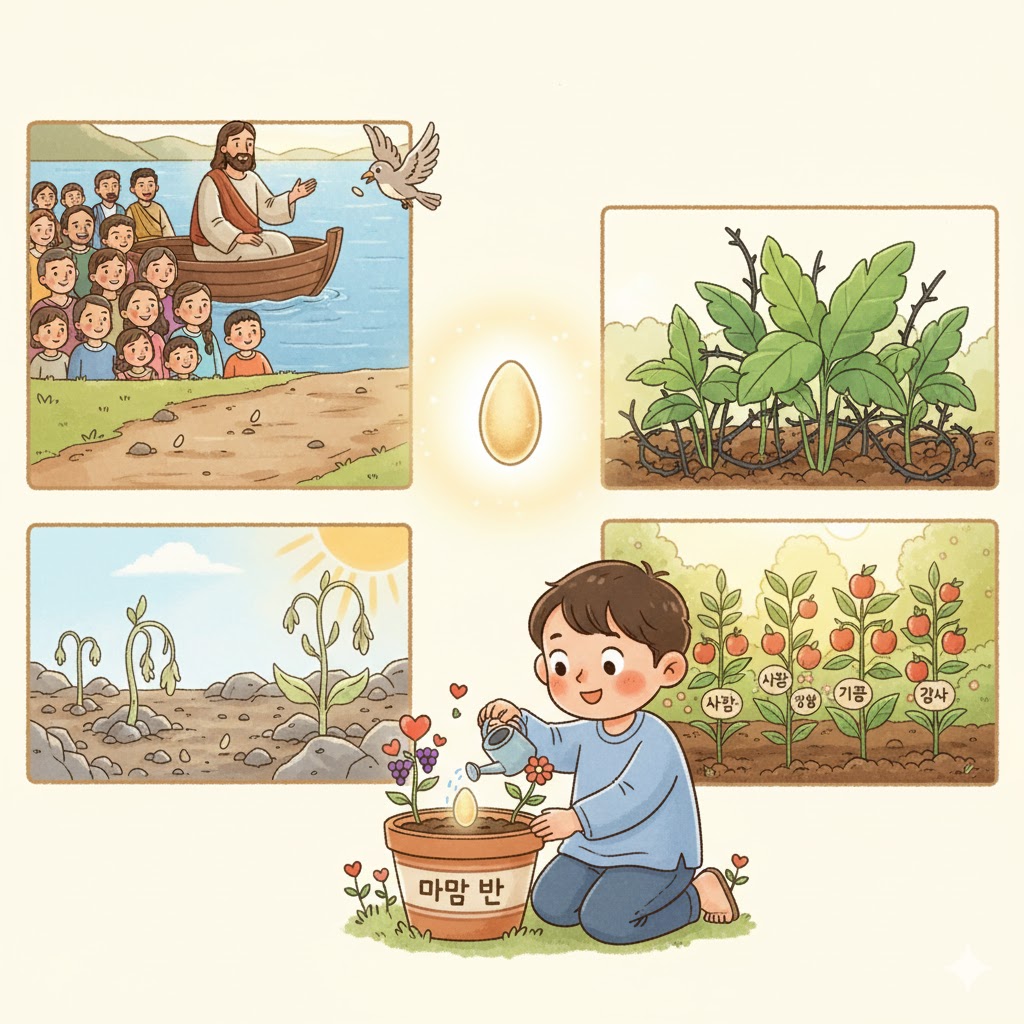 [꾸준히 말씀을 들을 때 성장해요] [마가복음 4장 1-20절]뜨거운 여름 햇볕 아래 무럭무럭 자라나는 식물들처럼, 우리 마음도 말씀으로 쑥쑥 자라날 수 있어요. 하지만 모든 씨앗이 똑같이 자라나