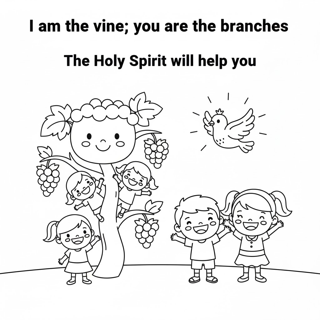 성경이야기: 예수님은 자신을 '포도나무'라고 말씀하셨어요. 그리고 우리를 포도나무에 붙어있는 '가지'에 비유하셨어요. 가지가 포도나무에 붙어 있어야 열매를 맺을 수 있어요. 우리도 예수님 안에 꼭 붙어있어야 좋은 믿음의 열매를 맺을 수 있답니다.