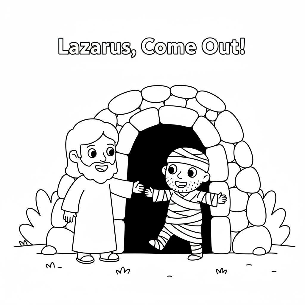 성경이야기: 예수님의 친구 나사로가 병이 들어 죽었어요. 나사로의 누이들인 마르다와 마리아는 슬퍼했어요. 예수님은 무덤에 가서 큰 소리로 "나사로야, 나오너라!" 하고 부르셨어요. 그러자 나사로가 벌떡 일어나 무덤에서 걸어 나왔어요. 예수님은 죽은 사람도 살리시는 하나님의 아들이세요.