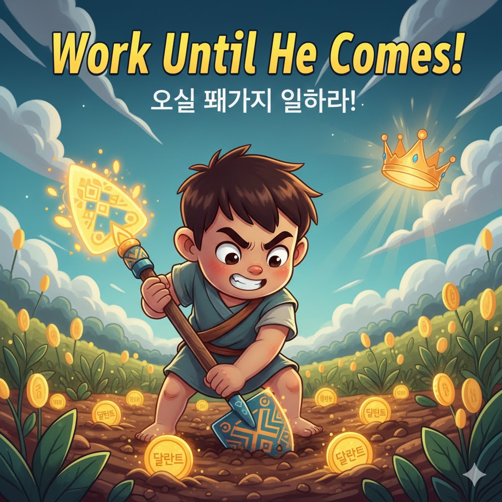 예수님은 우리에게 Go and Do, 가서 Work하라고 Command, 명령하셨어요. 우리가 받은 Talent, 재능(그림 그리기, 노래하기, 다른 사람을 잘 돕는 것)이 무엇이든지, 그것은 Only Me, 나만을 위해 사용하라고 주신 것이 아니에요. God's Glory, 하나님의 영광을 위해, 그리고 다른 사람들을 Help, 돕기 위해 Invest, 투자해야 합니다. **Work Until He Comes!**를 실천하는 Faithful Steward, 충성된 청지기가 됩시다.