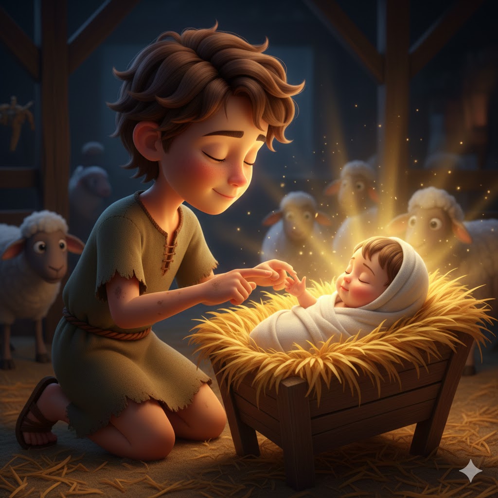 드디어 도착한 마구간. 형들은 화려한 천사를 본 이야기를 하느라 정신이 없었지만, 다니엘은 조용히 구유 곁으로 다가갔어요. 그리고 떨리는 손을 내밀어 아기 예수님의 작은 손을 살며시 만졌어요.
