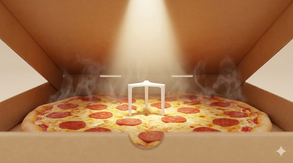 (PPT 클릭 2/이미지 2 - 피자 삼각대) 자, 이 하얀 플라스틱 본 적 있죠? 피자 시키면 가운데 꽂혀 오는 건데, 이거 이름이 뭘까요? '피자 삼각대(피자 세이버)'라고 해요. 많은 친구가 이걸 보고 '그냥 장식인가?', '쓰레기네' 하고 휙 버려요. 하지만 이게 없으면 어떻게 될까요? 뜨거운 피자가 배달될 때 치즈가 종이 박스 뚜껑에 다 들러붙어서 엉망진창이 되고 말아요. 이 작고 하찮아 보이는 플라스틱이 맛있는 피자를 지켜주는 아주 중요한 역할을 하는 거예요.