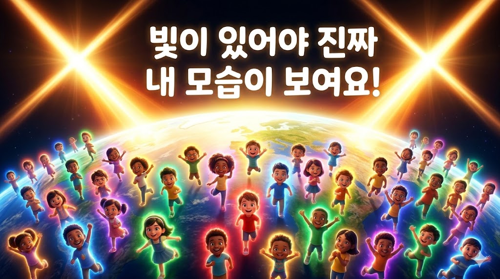친구들, 왜 하나님은 예쁜 꽃이나 귀여운 강아지를 먼저 만들지 않으시고, **'빛'**을 제일 먼저 만드셨을까요? 맞아요! 아무리 멋진 나무와 동물들을 만들어 놓으셔도, 빛이 없으면 그 아름다운 색깔과 모습을 전혀 볼 수 없기 때문이에요. 하나님이 비춰주신 그 눈부신 창조의 빛이 있었기에, 세상의 모든 생명체가 각자 자기만의 예쁜 색깔을 뽐낼 수 있게 된 거예요.