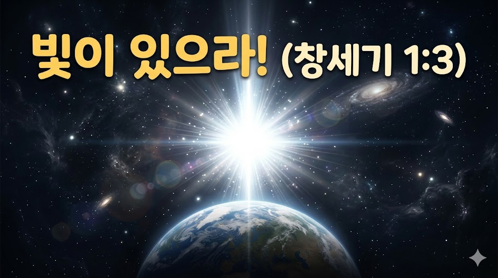 (슬라이드 4: 장엄한 우주와 지구 위에 눈부신 하얀 빛이 창조되는 일러스트. 텍스트: 빛이 있으라! (창세기 1:3)) (PPT 클릭 4번: 창조의 빛 이미지 등장)