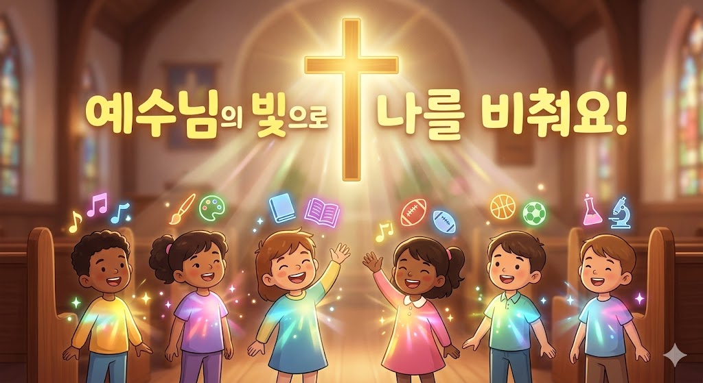 (슬라이드 5: 사순절을 보내며 십자가의 빛을 받아 자신의 고유한 색깔(달란트)을 밝게 빛내는 어린이들의 일러스트. 텍스트: 예수님의 빛으로 나를 비춰요!) (PPT 클릭 5번: 십자가 빛을 받는 어린이 이미지 등장)